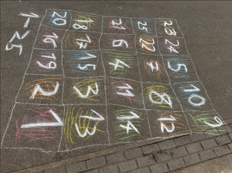 • Malt euer Spiel mit Straßenkreide auf (Hüpfspiel, Labyrinth, Bewegungsfeld – ganz wie ihr möchtet).
