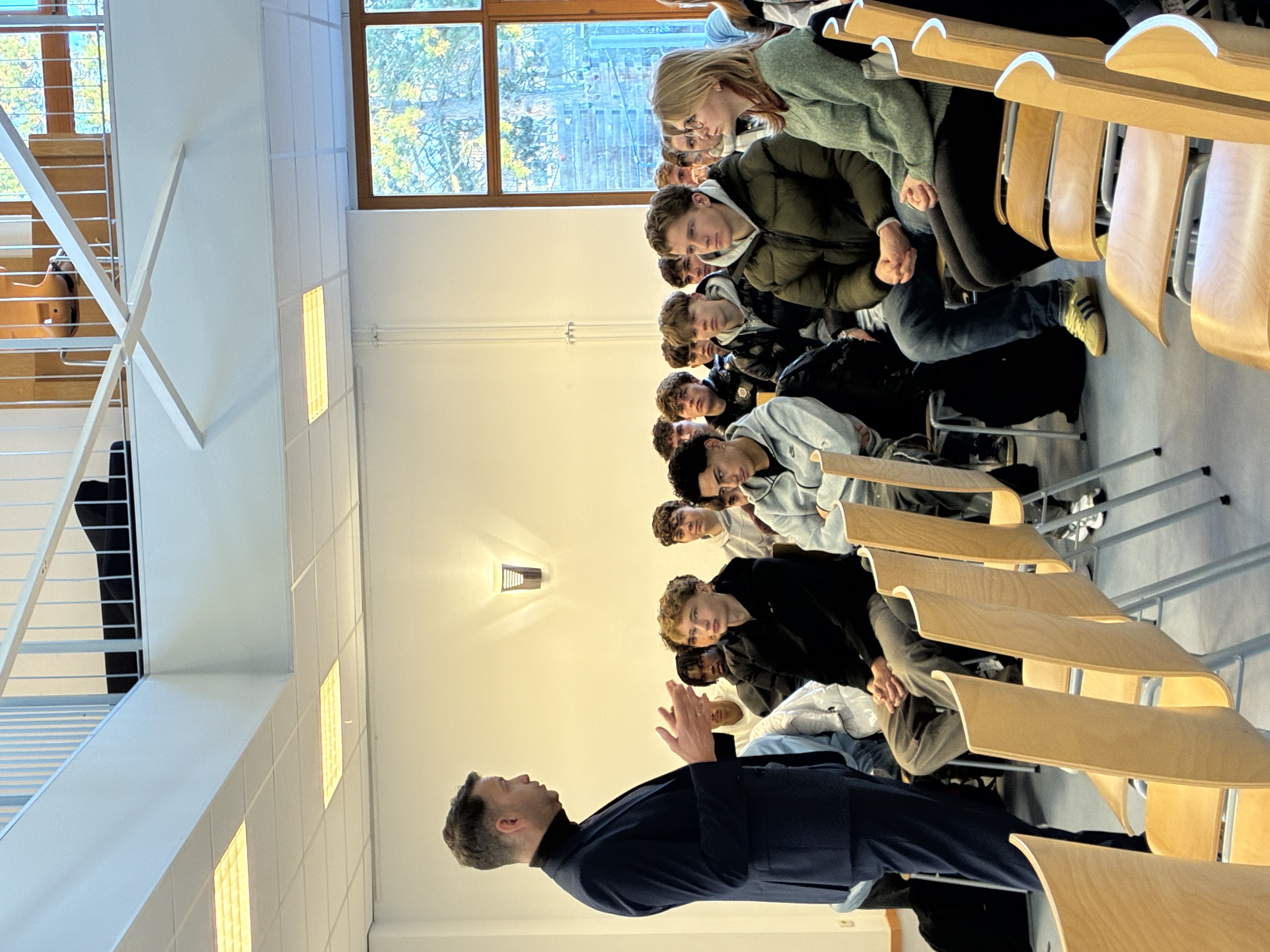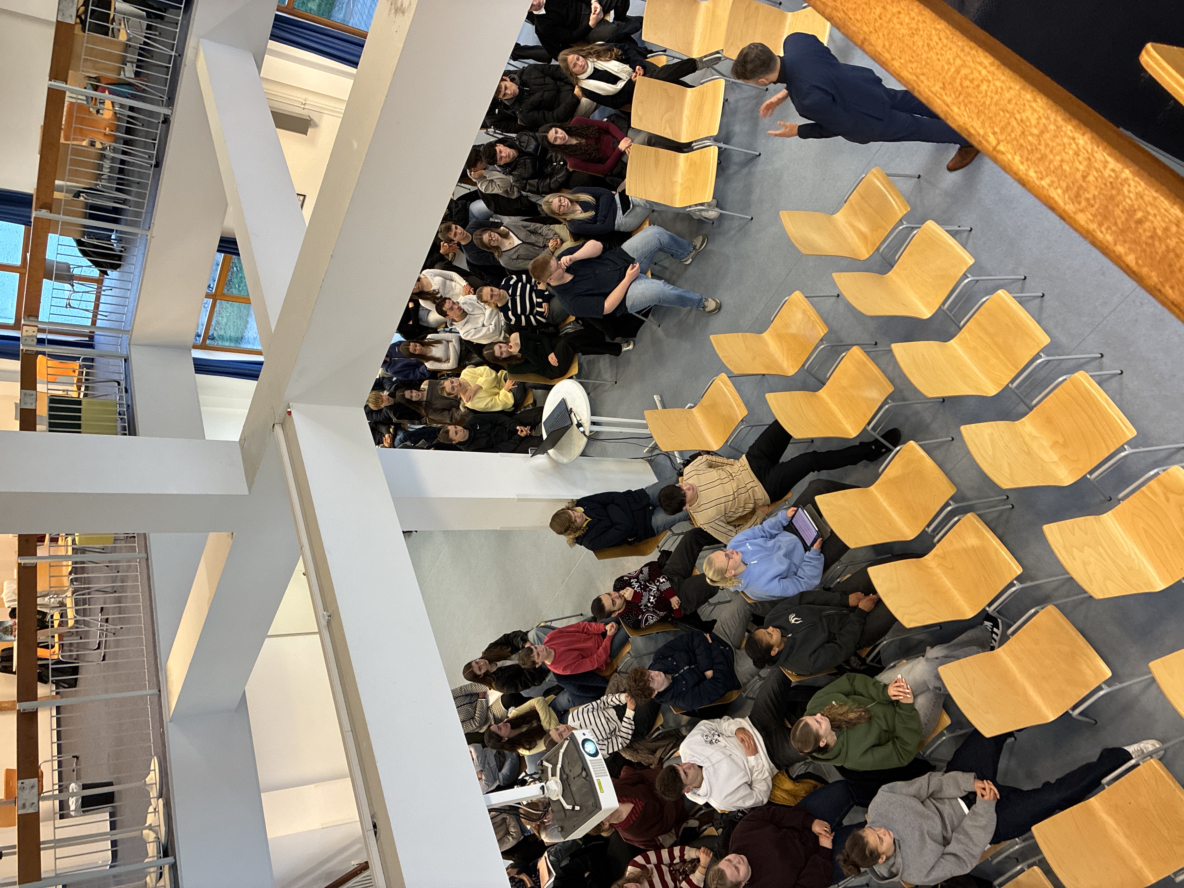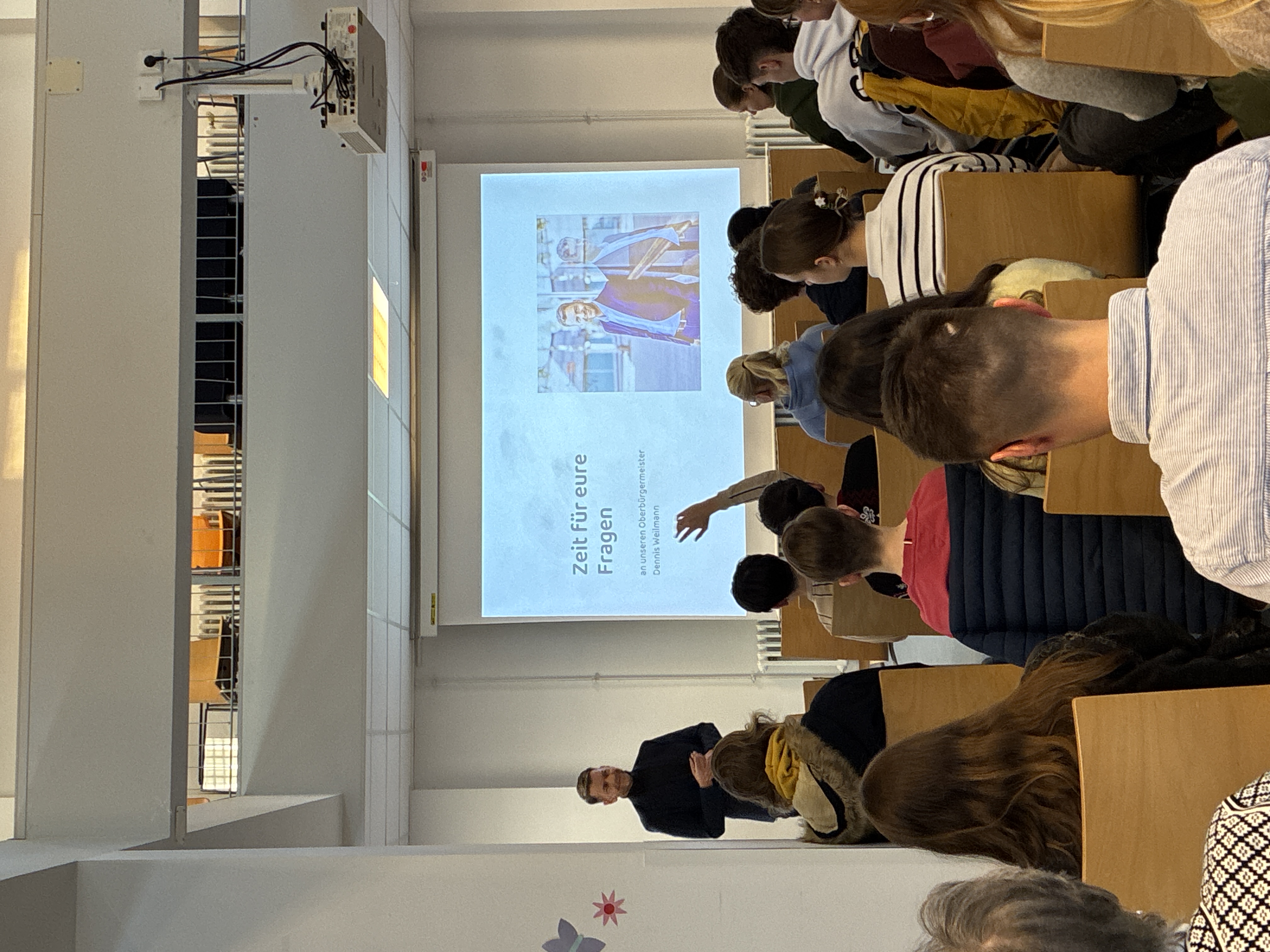 Den größten Teil der Unterrichtsstunde nimmt dann der offene Dialog mit dem Oberbürgermeister ein. Die Schülerinnen und Schüler haben die Gelegenheit, alles zu fragen, was sie bewegt: Was macht ein Oberbürgermeister eigentlich den ganzen Tag? Darf er alles alleine entscheiden? Und wann wird eigentlich der Jugendtreff bei uns im Dorf saniert? Oberbürgermeister Dennis Weilmann steht Rede und Antwort, erklärt Hintergründe, hört zu und nimmt Anregungen ernst.